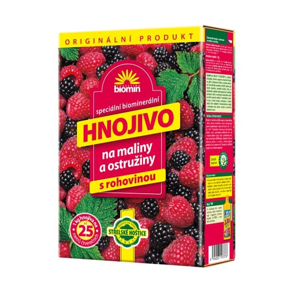 složení: N 6 %, P 5,5 %, K 6 %, Mg 2 % Popis:Biomin na maliny a ostružiny je vydatné, ekologicky příznivé organicko-minerální hnojivo, jehož významnou složkou je drcená rohovina. Tato přírodní surovina je zvláště ceněna pro obsah organicky vázaného dusíku, který se působením půdních mikroorganismů uvolňuje postupně, takže je rostlinami maximálně využit po delší vegetační obobí. V optimálním poměru jsou v tomto hnojivu zastoupeny i ostatní zdroje živin, nezbytných k harmonickému vývoji a zdravému růstu malin a ostružin. Použití:Hnojení Biominem na maliny a ostružiny se provádí 2x ročně a to na začátku a na konci vegetačního období, kdy stejnoměrně rozhodíme a poté zapravíme do půdy. Dávkování: