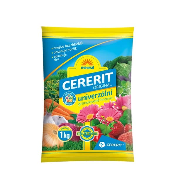 složení: 8% N + 13% P2O5 + 11% K2O + 2% MgO + stopové prvky Popis:Cererit je oblíbené granulované bezchloridové minerální hnojivo se stopovými prvky. Je určeno pro široké použití v zahradě při výživě ovoce, zeleniny, květin, chmele, okrasných stromů a keřů. Použití:Aplikuje se rozhozením a zapravením do půdy při její přípravě k setí nebo sázení a při přihnojování během vegetace. Doporučuje se rozdělit dávku hnojiva v poměru 2/3 před výsadbou a zbývající 1/3 k přihnojení během vegetace. Dávkování: