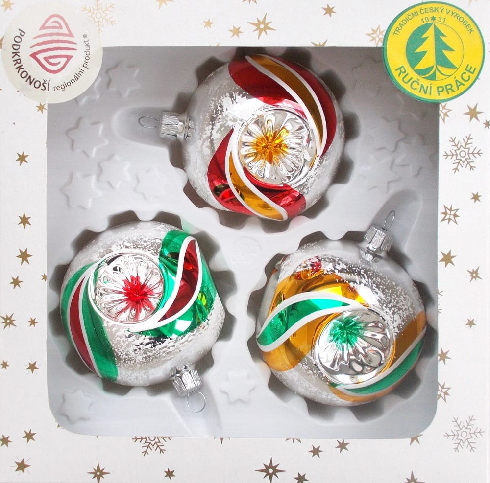 vánoční skleněná ozdoba stříbrné koule s barevným zdobením 80 mm